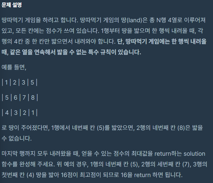 land[i][1] += max(land[i-1][0], land[i-1][2], land[i-1][3])